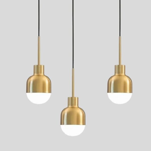 This acorn-shaped pendant lamp brings a touch of modern Scandinavian style to any space. The gold-colored metal frame combines clean, minimalist lines with decorative details that give it eye-catching appeal. Perfect for making a statement in your bedroom, dining room or living room, this pendant light features an architectural shape that will become a focal point without overwhelming the room. The gold finish complements both traditional and contemporary interiors. Hang it over your dining table for a stylish glow during meals or above a nightstand to set the perfect mood for reading before bed. This decorative yet functional light fixture adds instant personality wherever you choose to place it.