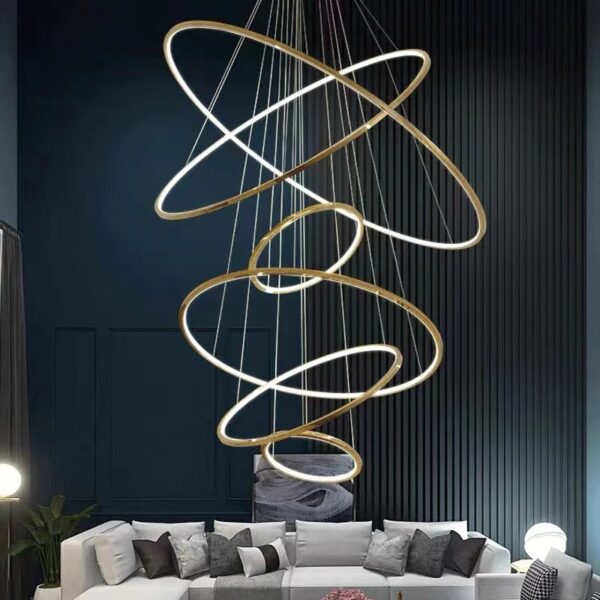 This modern minimalist pendant light brings luxury and style to restaurants, stairwells and high-ceilinged spaces. The multiple concentric circles of electroplated gold colour create a visually stunning sculpture of light that will become the focal point of the room. Suspended from the ceiling by a single wire, this Laloopor light fixture rotates effortlessly, casting its warm glow in every direction. Perfect for illuminating a large duplex villa entryway, this circular chandelier combines simplicity of design with understated elegance, providing ambient illumination that enhances the atmosphere without overwhelming the space. Whether you’re looking to elevate a restaurant dining room or add ambient lighting to a spacious stairwell, this rotating pendant light brings architectural drama and timeless luxury.