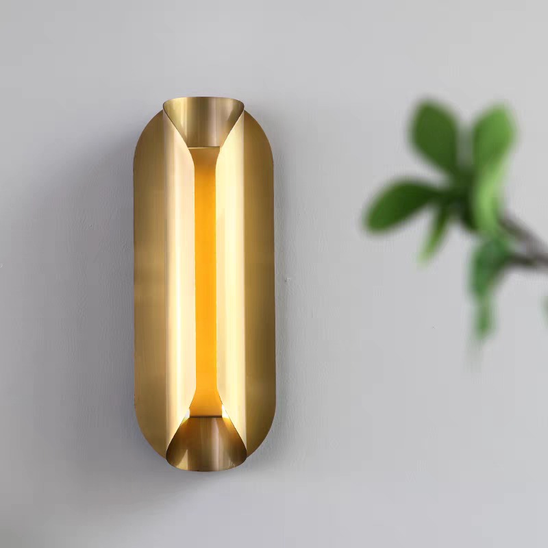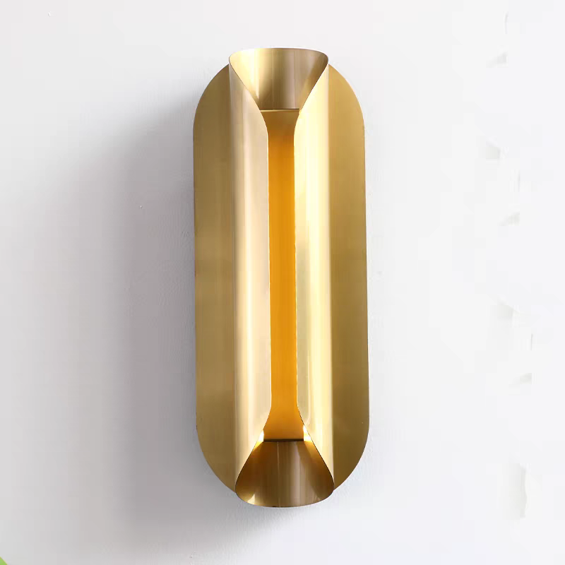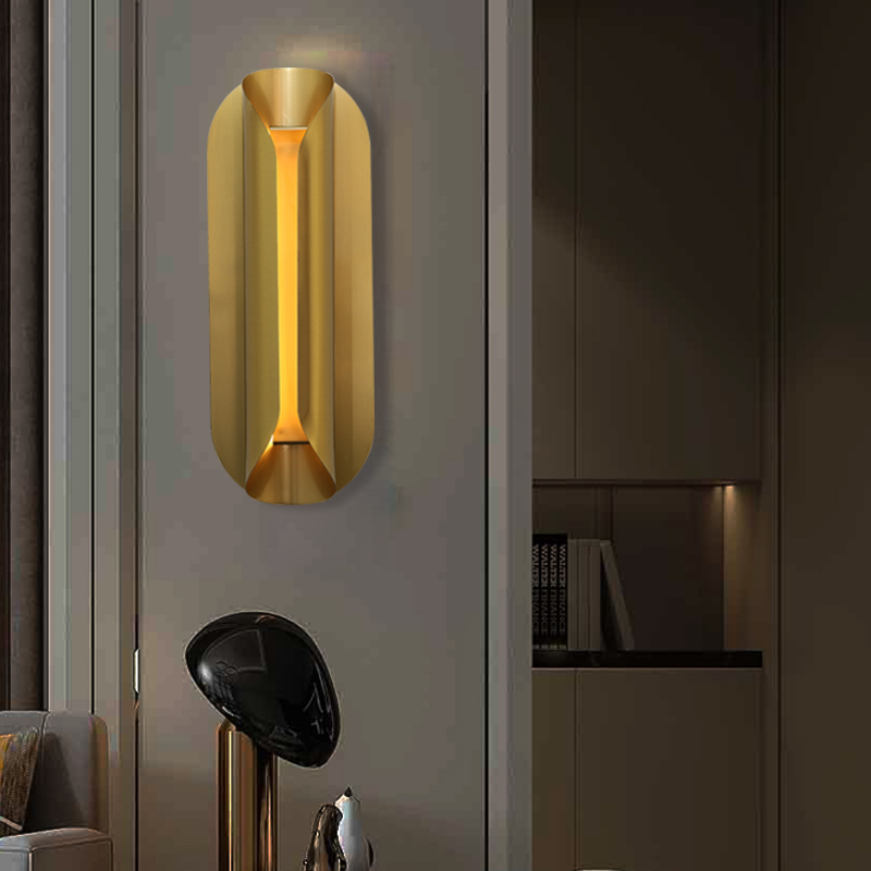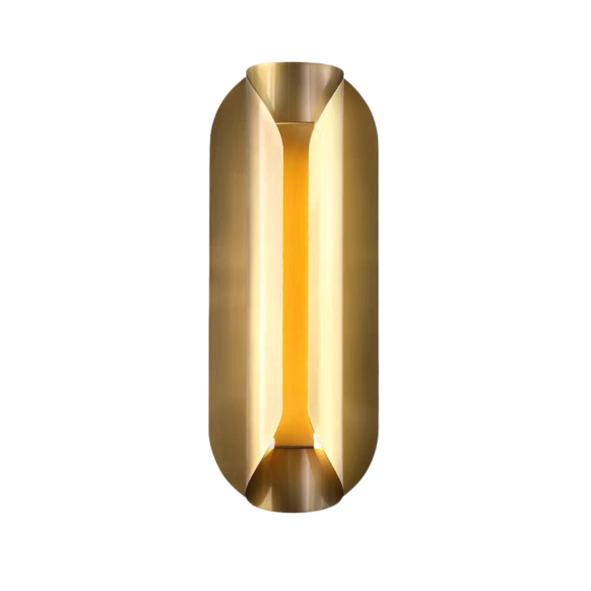 A soft golden sheen washes over its fluid, curved planes, creating dynamic reflections and an alluring play of light and shadow. The central slit emits a warm, indirect glow that adds ambiance without overpowering, perfect for hallways, bedrooms, luxury bathrooms, or any space that deserves a refined touch of design drama.