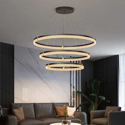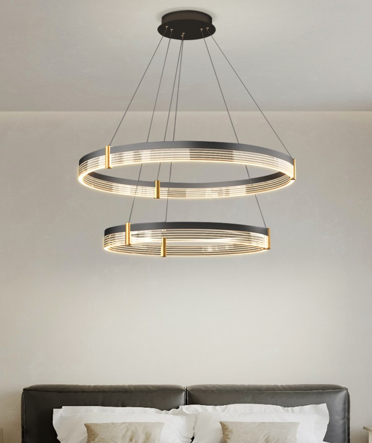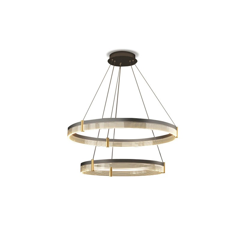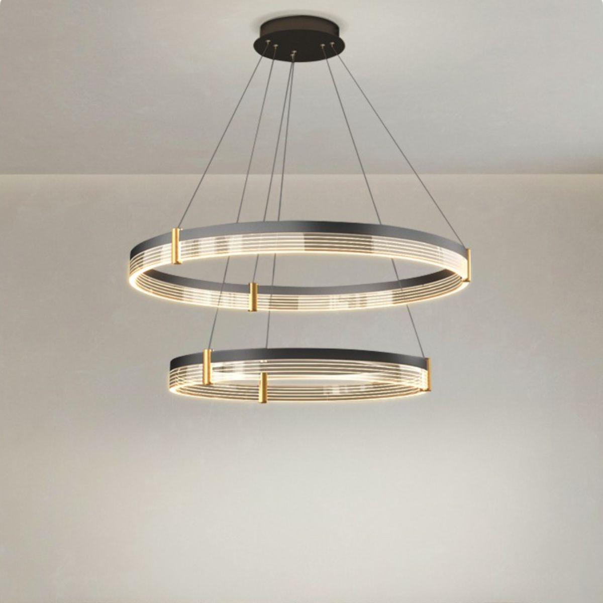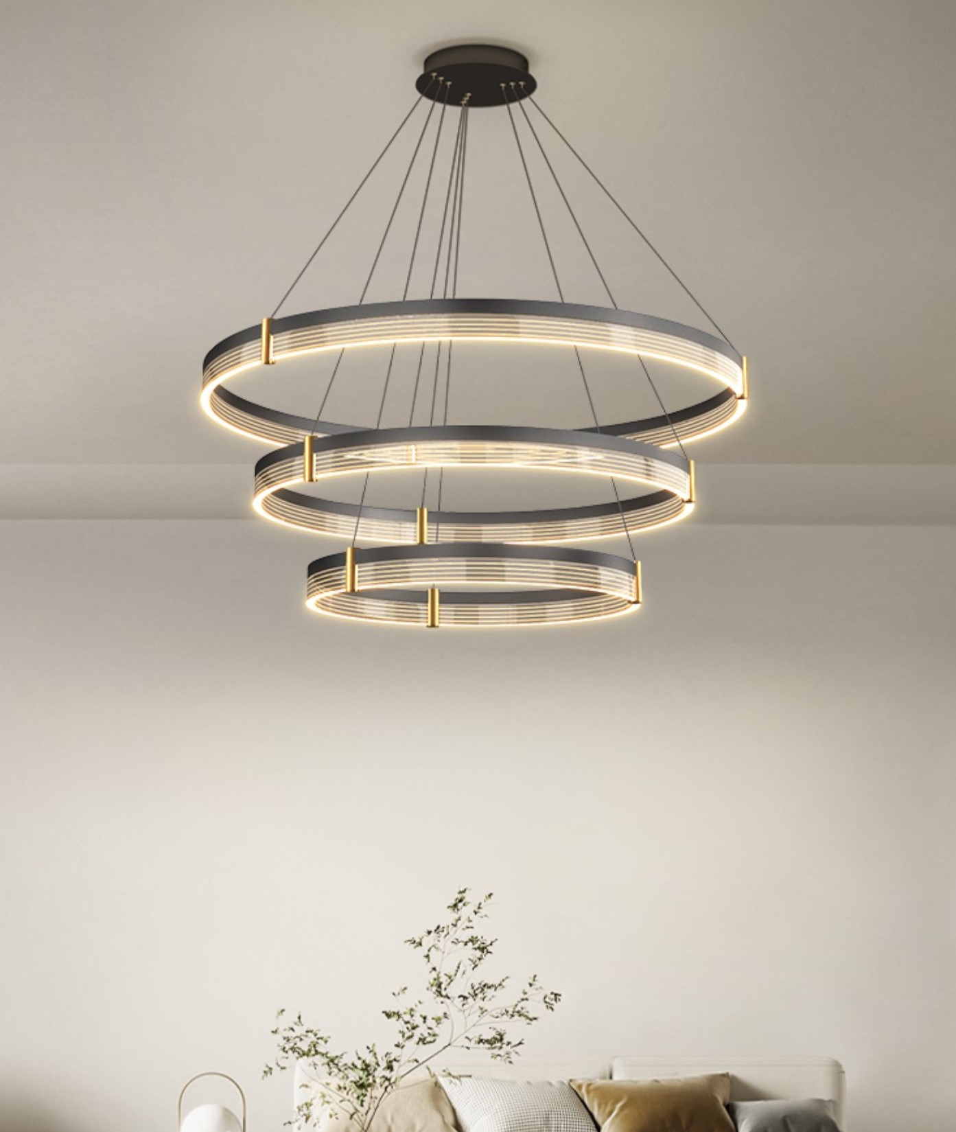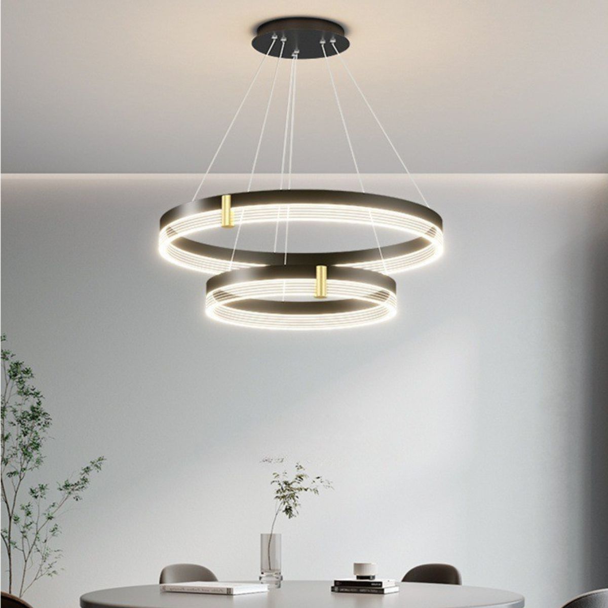 Elevate your space with the Sigrid Halo Tiered Ring Pendant Lamp, which beautifully combines modern design with sculptural elegance. It features smooth, layered rings that hang gracefully from thin cables, creating a floating halo look that adds a dramatic, architectural touch to any room. The lamp has a matte black finish with brushed gold details, giving it a refined and stylish appearance. It also includes built-in LED lights that produce a soft, warm glow, making it perfect for areas like dining rooms, living rooms, staircases, or entryways. Available in double or triple ring setups, the Sigrid lamp draws attention upward and turns your ceiling into a standout feature. Inspired by the movement of planets and minimalist design, it’s an excellent choice for those looking for a modern tiered chandelier, an LED ring pendant, or a luxurious ceiling light.