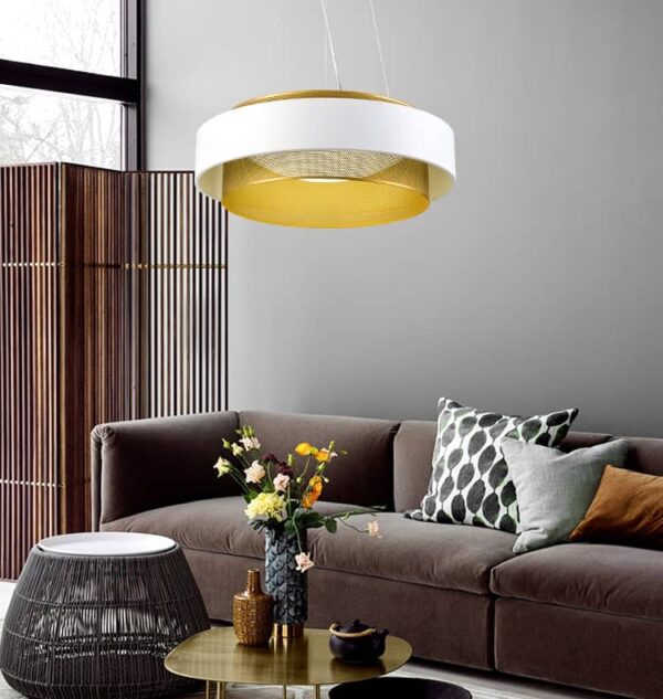 This slim drum pendant lamp brings unique design to its finest. Marrying class brass-gold color details with minimalist basics of black and white, with a slim drum design, this easily accentuates modern, minimalist, and classy tones and interior design styles. Fitting for pantry lights, reception lights, dining lights, or even use large size in your living room, this style fits perfectly. We call it a touch of class to earthy minimalism.